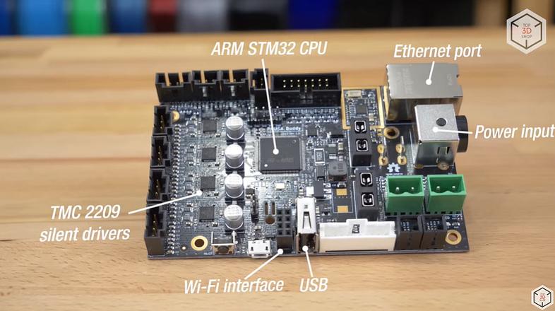 Original Prusa Mini+ оснащается кастомной 32-битной материнской платой с тихими драйверами Trinamic 2209 и цветным ЖК-экраном. Модуль беспроводной связи предлагается в качестве опции.